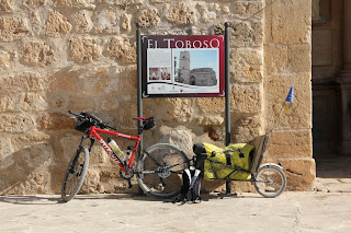 Esta mañana a las 9 pasé por el Toboso. El paisaje parece que comienza a cambiar. He dejado los inmensos campos de trigo segado y empiezo a ver mucha vid. Las sombras en el camino siguen siendo escasas, pero lo compensa el verde de las plantas aunque, eso sí, las llanuras siguen siendo infinitas y los caminos, rectas que nunca se acaban. Tras valorar el calor sofocante que comienza a hacer prácticamente desde las 10 de la mañana, la disponibilidad de alojamiento y las fuerzas que me quedan, he decido llegar hasta este pueblo Mañana no sé. No me preocupa. Lo cierto y verdad es que mis piernas están ya muy tocadas y tengo sobrecarga en los músculos del cuello. Supongo que tras 6 ó 7 horas pedaleando será normal... Lo que más me duele cada mañana al sentarme de nuevo en la bici es -sí, sí. Justo lo que estás pensando- el culo. El sábado antes de partir estuve viendo en la tele una carrera mtb de 7 etapas por el desierto y Santi Millá era participante y comentarista. Pues precisamente dedicó un buen rato a pasar por las tiendas de campaña de los participantes y preguntarles cómo llevaban el culo después de varias jornada. La respuesta era unánime y eso precisamente es lo que me está pasando a mí. ¡Cómo echo de menos que alguno de mis amigos venga a ponerme cremita! jajajaja. ¡Vale! ¡Que es broma! No quiero comentarios al respecto ¿ok?